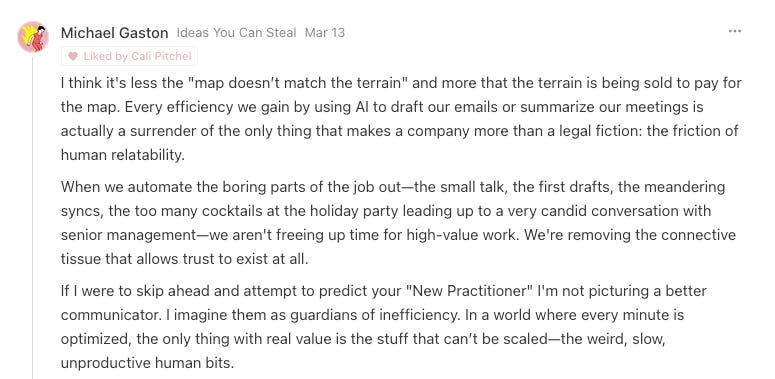Michael Gaston left a great comment on Part 1. His framing — the guardian of inefficiency — is the best description of what this requires in practice. In a moment defined by optimization, someone needs to protect the things that look like waste but are critical infrastructure for culture, trust, and meaning.
